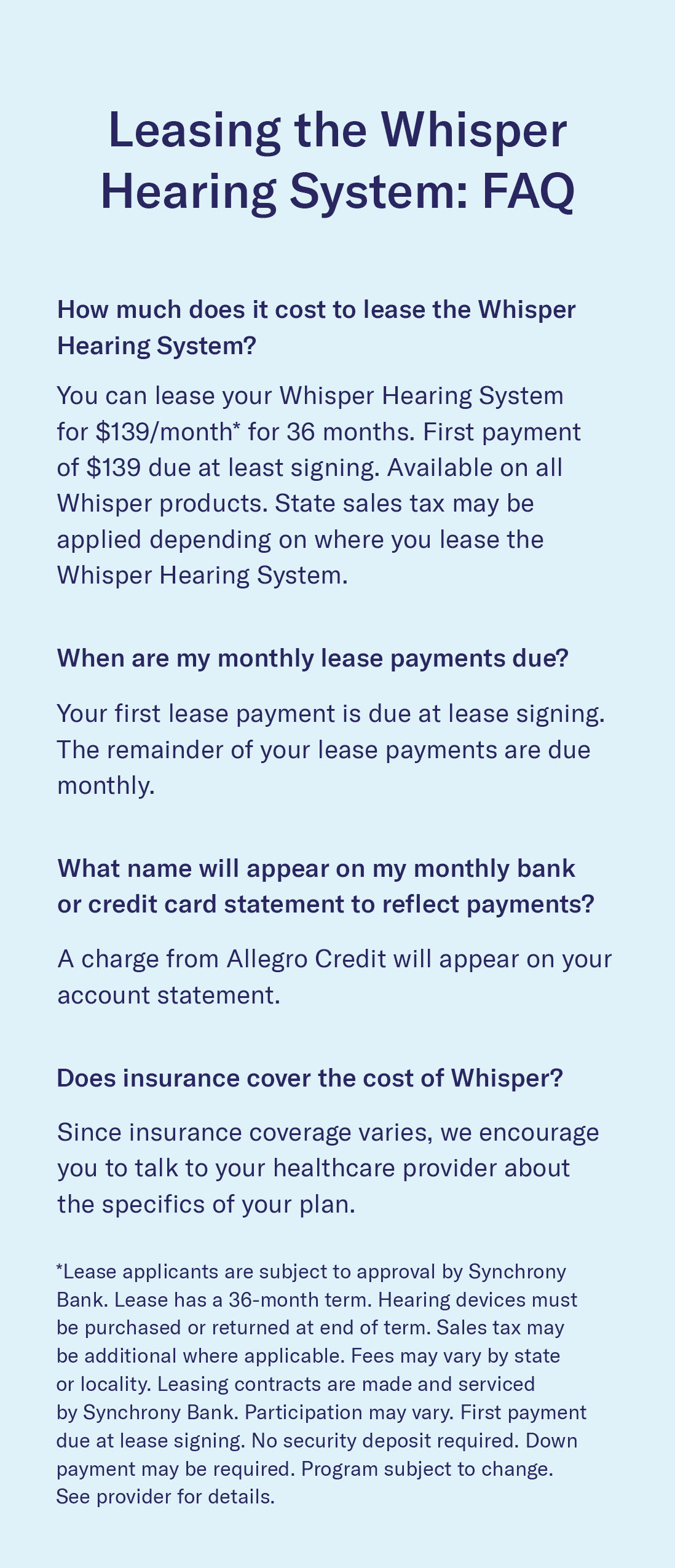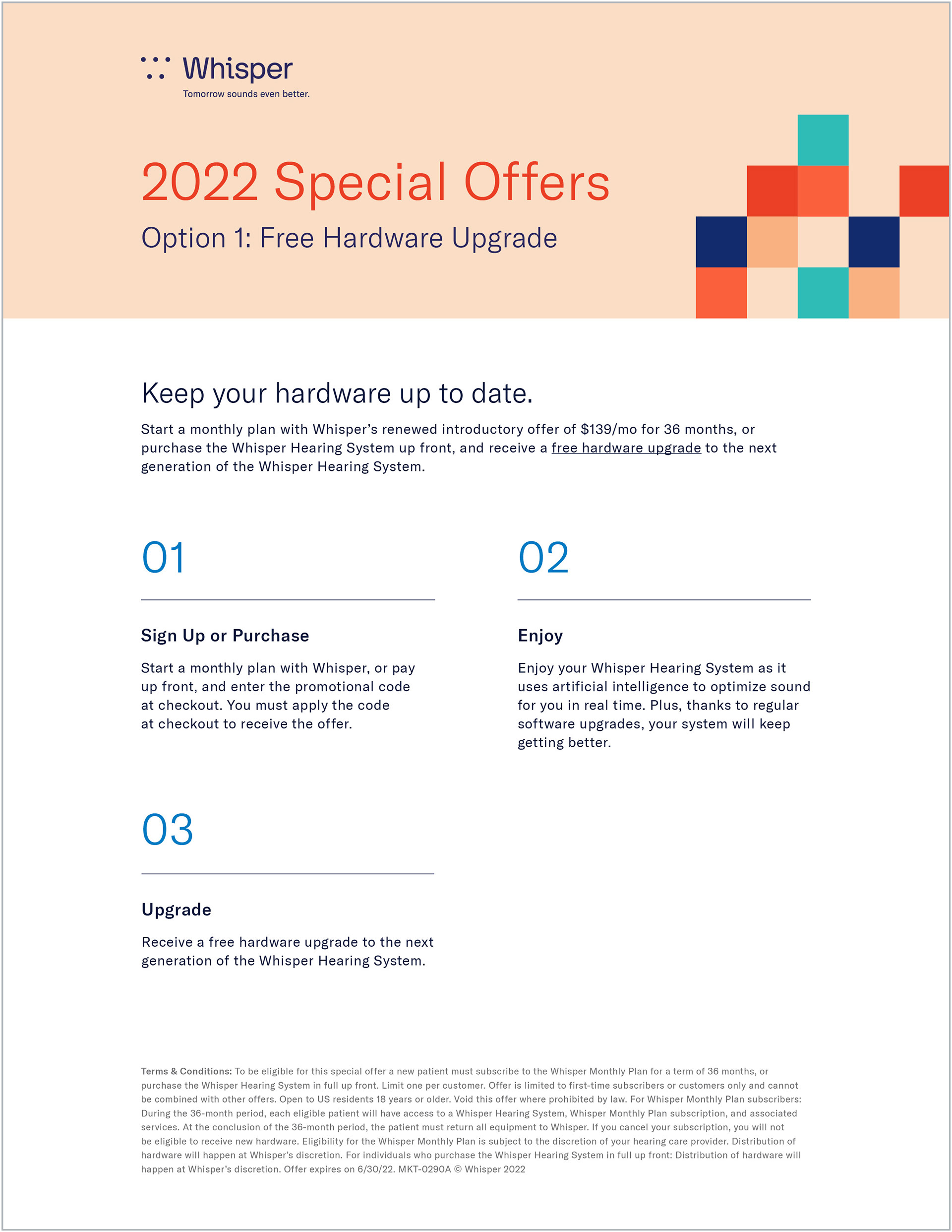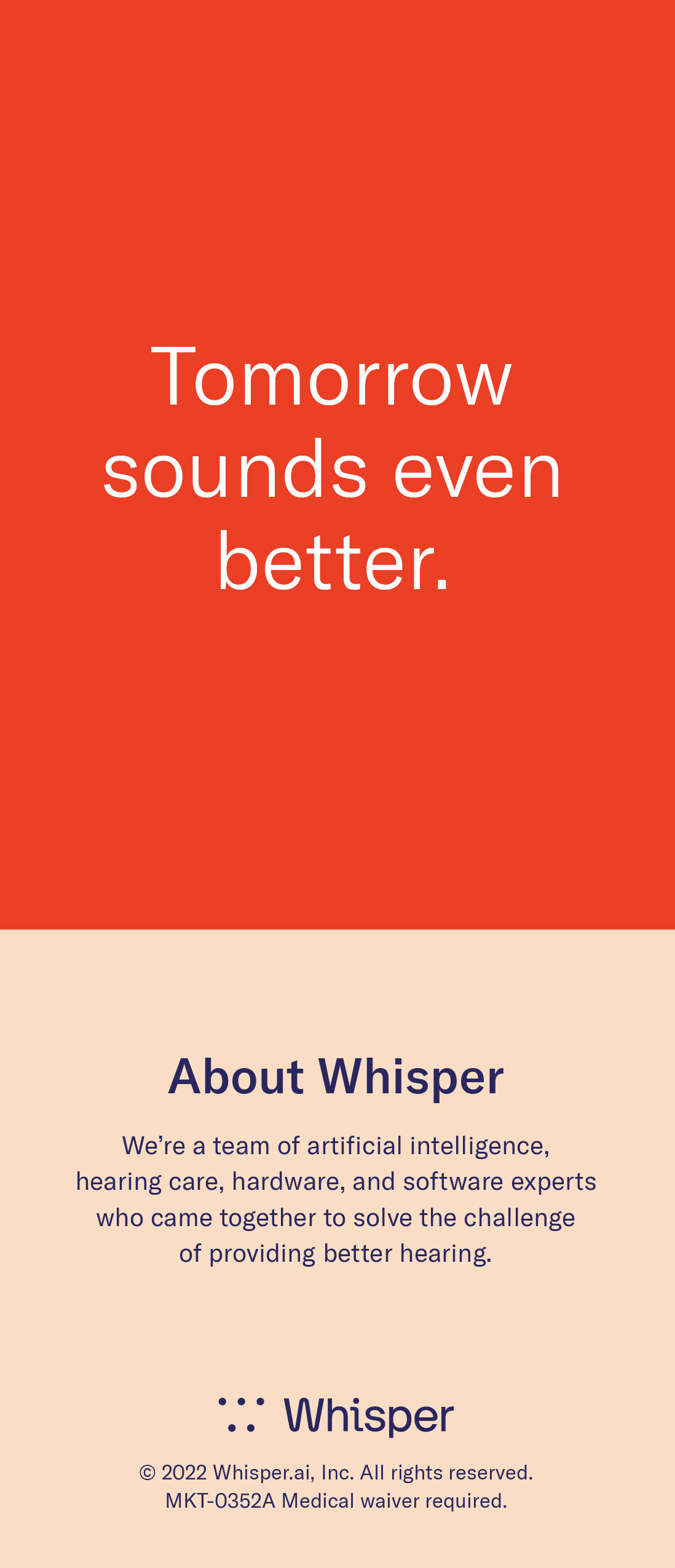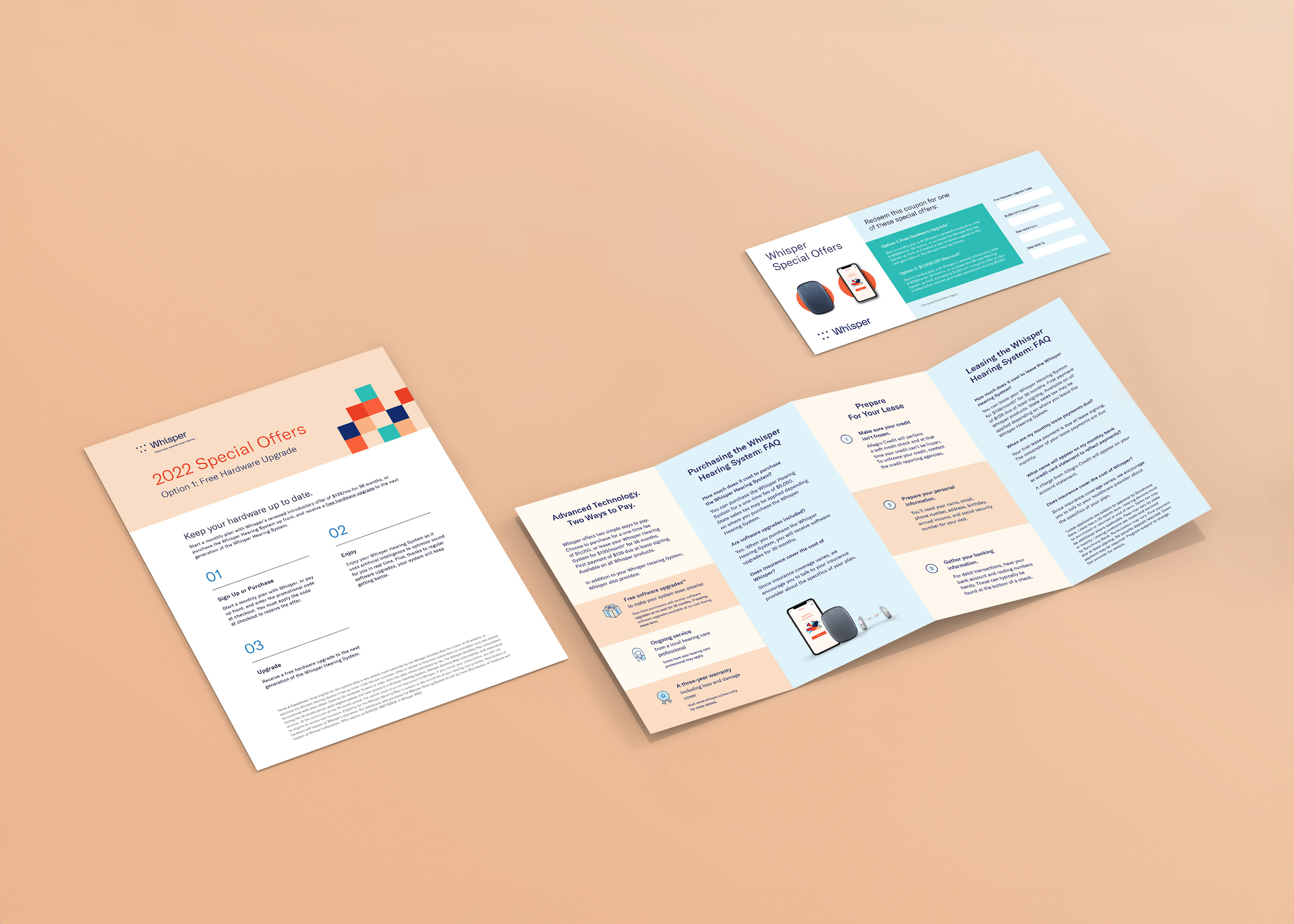 Various print materials for the company Whisper, a leader in the hearing aid industry.